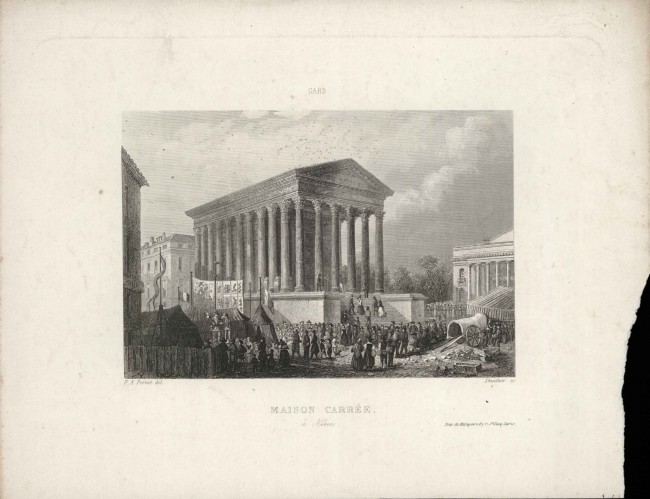 Planche publiée (entre les p. 52 et 53) dans : Girault de Saint-Fargeau, Dictionnaire géographique, historique, industriel et commercial de toutes les communes de la France ... Vol. 3. Paris : Firmin Didot, 1846. Cet ouvrage contient également une vignette N « iconophore », avec vue des monuments de Nîmes, dont la Maison Carrée.